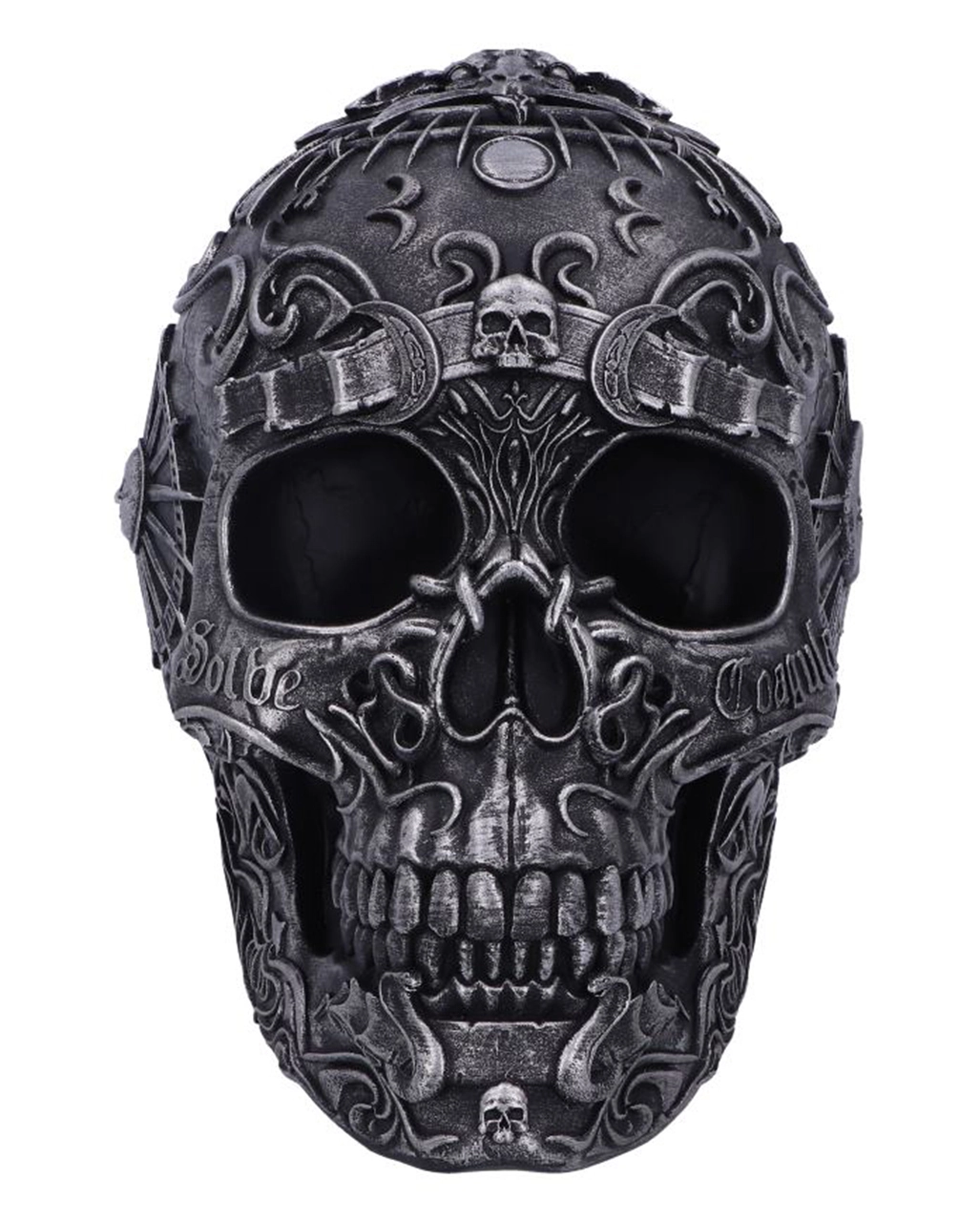 Baphomet´s Worship Totenschädel, der auf die Inquisition und die Folterungen der Tempelritter zurückgeht, ist mit den Worten Solve und Coagula dekoriert. Außerdem finden auf auf ihm zahlreiche okkulte Symbole. Fun Fact: Baphomet ist keinesfalls ein Symbol des Bösen, sondern die Verkörperung von Gegensätzen. Er wird auch als die Instanz angesehen, die für das Gleichgewicht im Universum sorgt. Unser Deko Totenkopf im Okkult Design macht sich super im Regal oder auf dem Tisch.