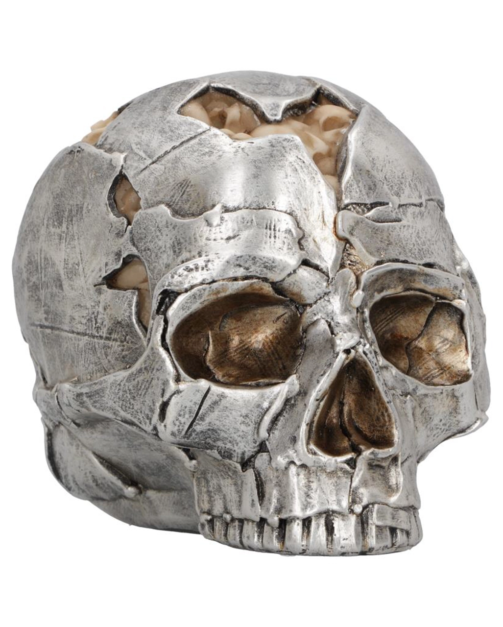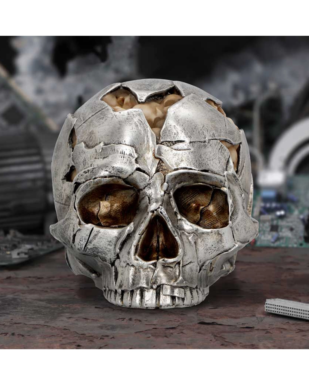 Cooler, aus Metallfetzen geformter Totenschädel. In den aufgeplatzten Rissen erscheinen zum Teil kleinere Schädel, die sich auf der Schädeldecke gebildet haben und einen Gehirn-Effekt erzeugen.