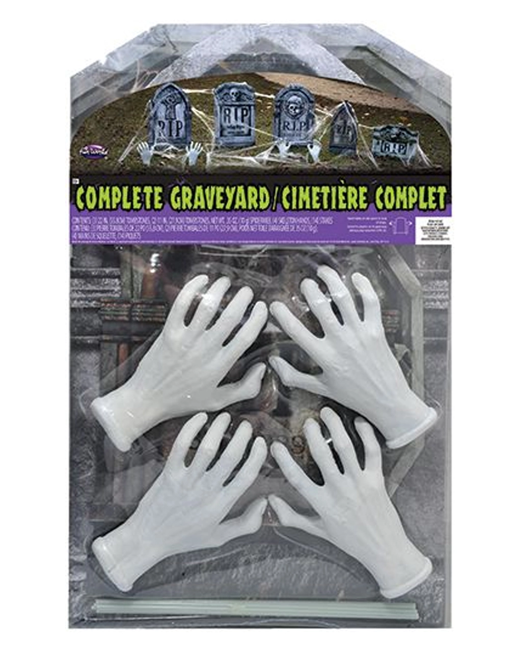 - Inhalt: 3x Grabstein 56cm, 2x Grabstein 28cm, 4 Zombie Hände, 14 Stäbchen zum Aufstellen, 10 Gramm Spinnweben