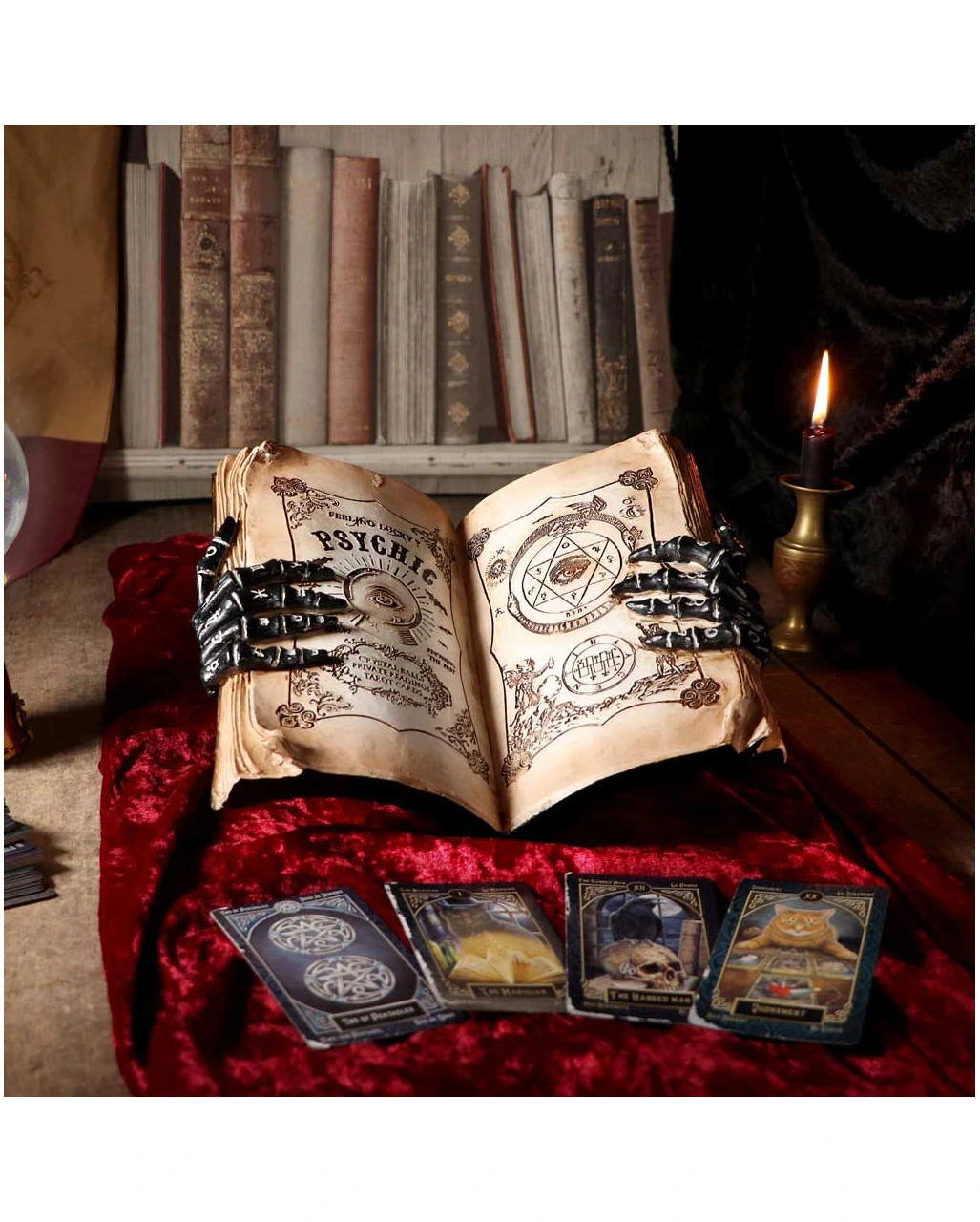 Die Chiromantie, auch Handlesekunst genannt, basiert auf dem Glauben, dass sich der Charakter und die Zukunft eines Menschen aus seiner Handfläche ablesen lassen. Unsere Hellseher Zauberbuch Deko ist an die Chiromantie angelehnt, denn das Buch wird von Skeletthänden mit mystischen Symbolen gehalten.