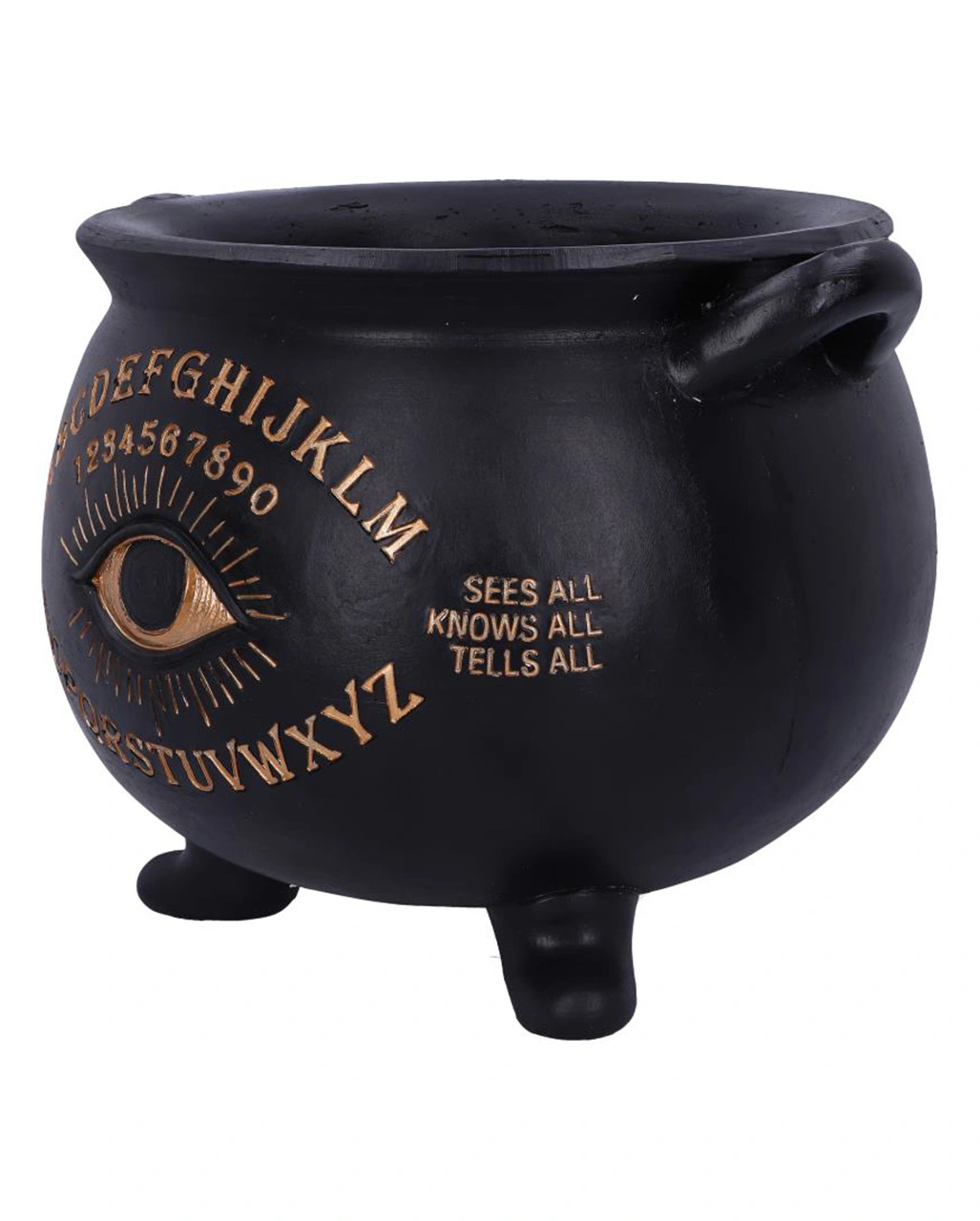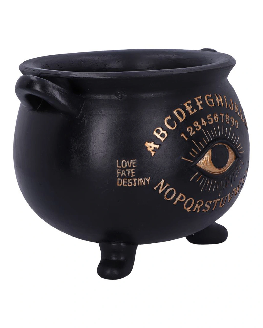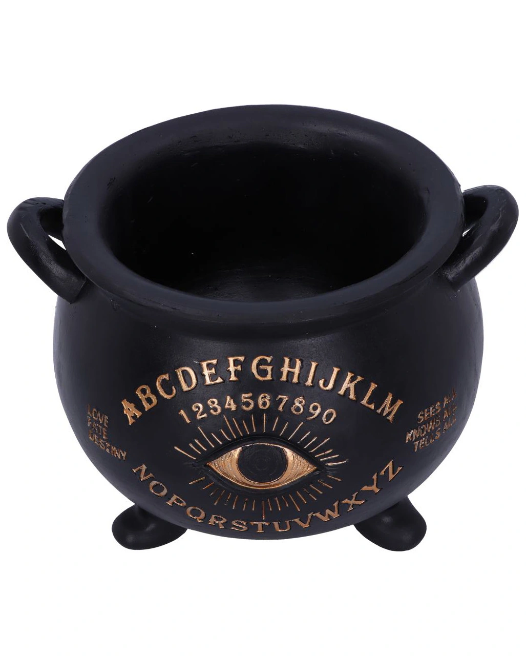 Der Hexenkessel im Ouija Design besitzt eine mattschwarze Oberfläche und verfügt über ein goldenes Auge in der Mitte. Das Dekoelement trägt die Worte „Love, Fate, Destiny“ und „Sees all, Knows all, Tells all“, die das Auge flankieren. Gegossen aus feinstem Kunststein, ist dieser schwarze Hexenkessel die perfekte Ergänzung für dein alternatives Wohndesign. Entdecke auch unseren Schwarzer Totenschädel Duftöl Teelichthalter und die Fate Schmuck & Zubehör Schale KILLSTAR